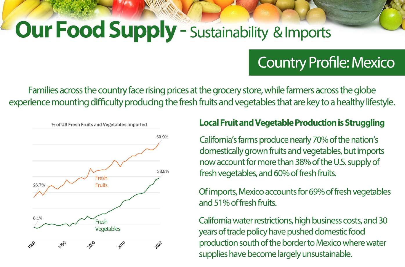 Food Supply – Sustainability & Imports The United States relies heavily on foreign production of fresh fruits and vegetables.  Many countries of origin are now facing water shortages and other adverse environmental impacts.  This Country Profile: Mexico looks at one of the major sources of imported fresh fruits and vegetables.